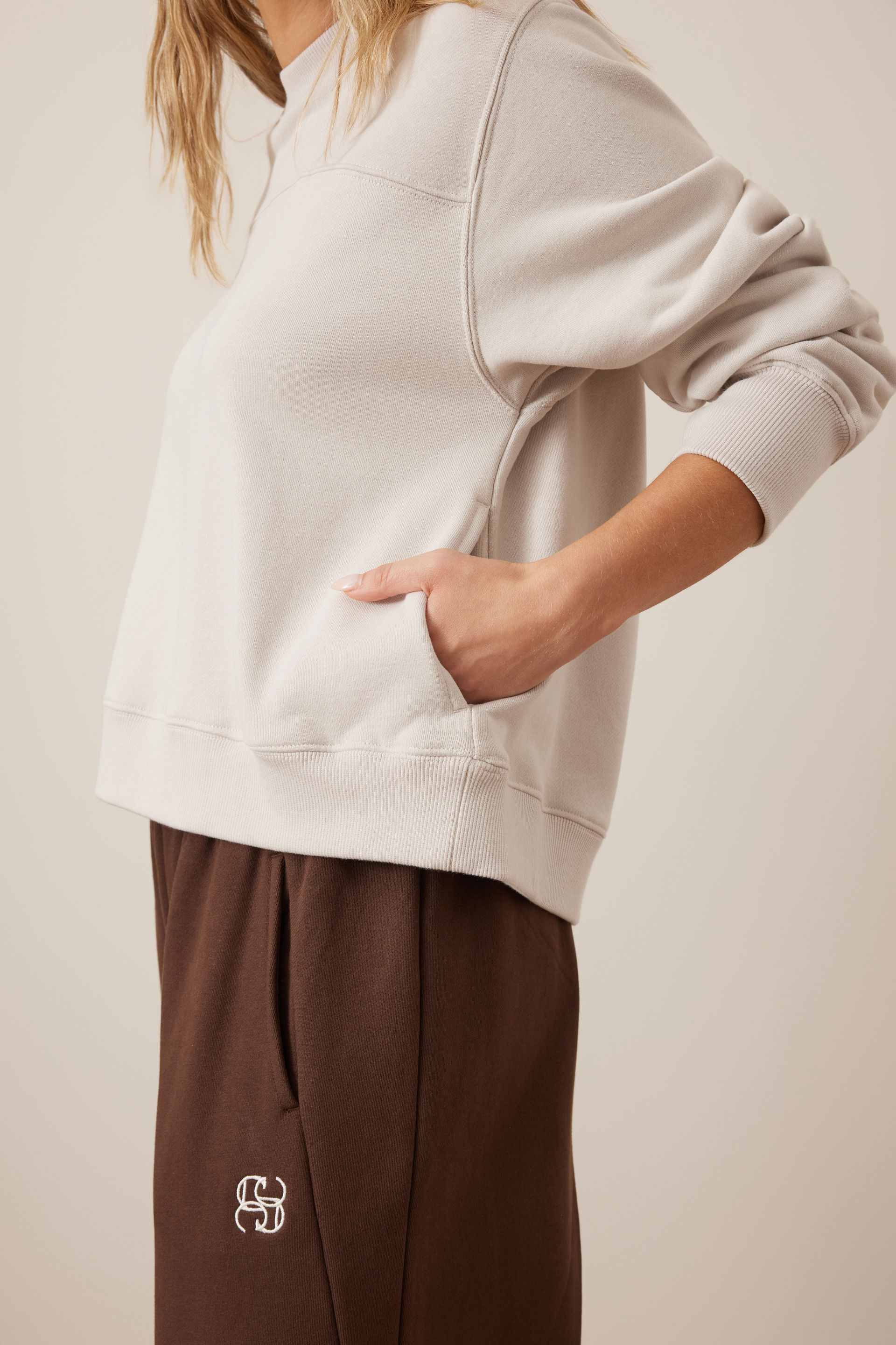 Meet our Seamed Fleece Top for the ultimate laid-back vibe. Crafted from an organic cotton blend with loopback fabric, this jumper is as comfy as it gets. The boxy above hip length fit creates that effortlessly relaxed look, with the subtle seam details. thumb holes, side pockets inverted box pleat add practical charm. Perfect for lounging or running errands with ease.