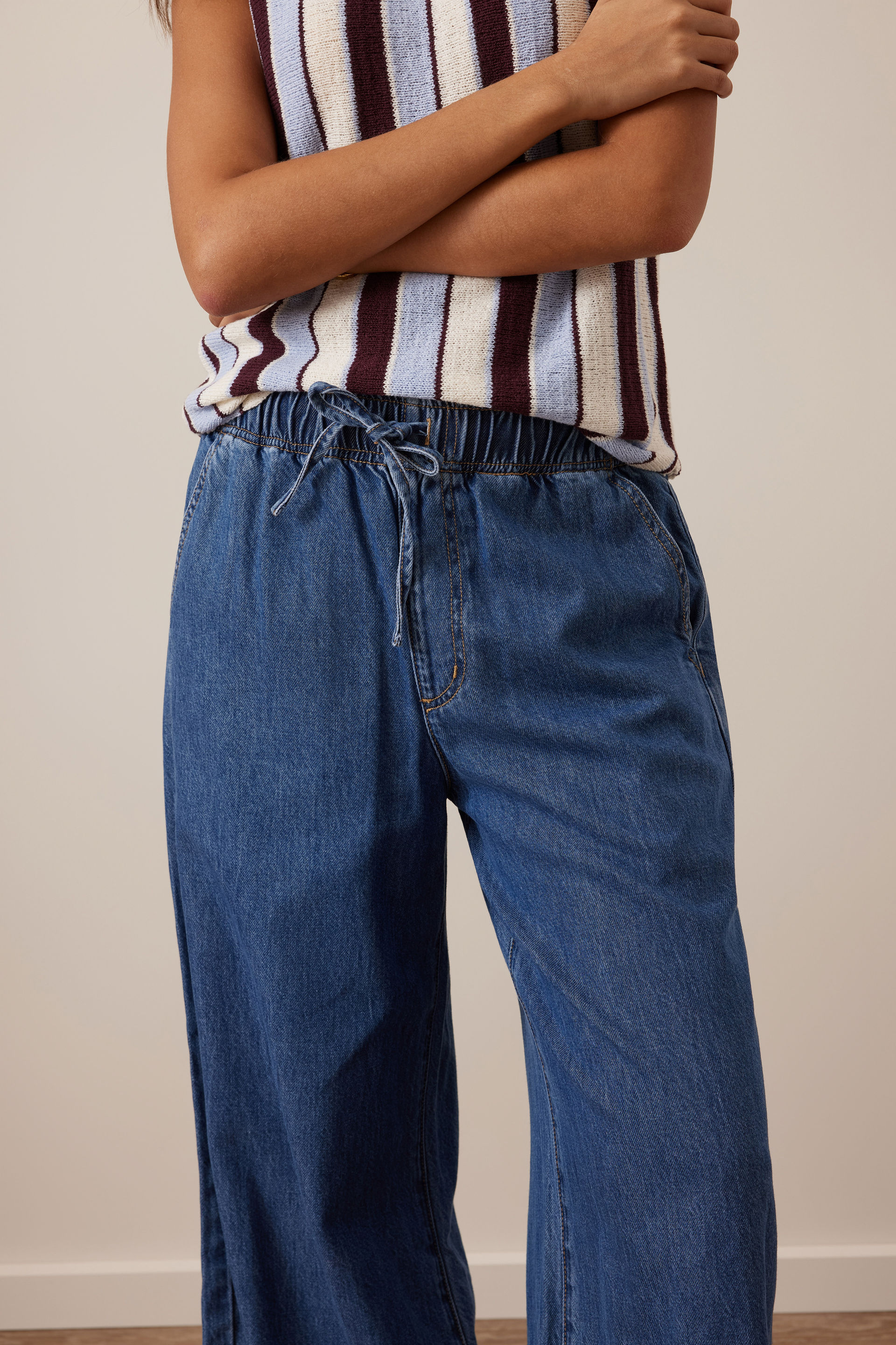 Step into effortless style with our Wide Leg Drawstring Pant. Crafted from a mid weight denim using 31% TENCEL™ with a soft hand feel. Featuring an elastic waist and drawstring, a wide leg silhouette, deep hems, and handy patch pockets at the back, these pants are the perfect blend of comfort and chic. These will be your new go-to for everyday wear.