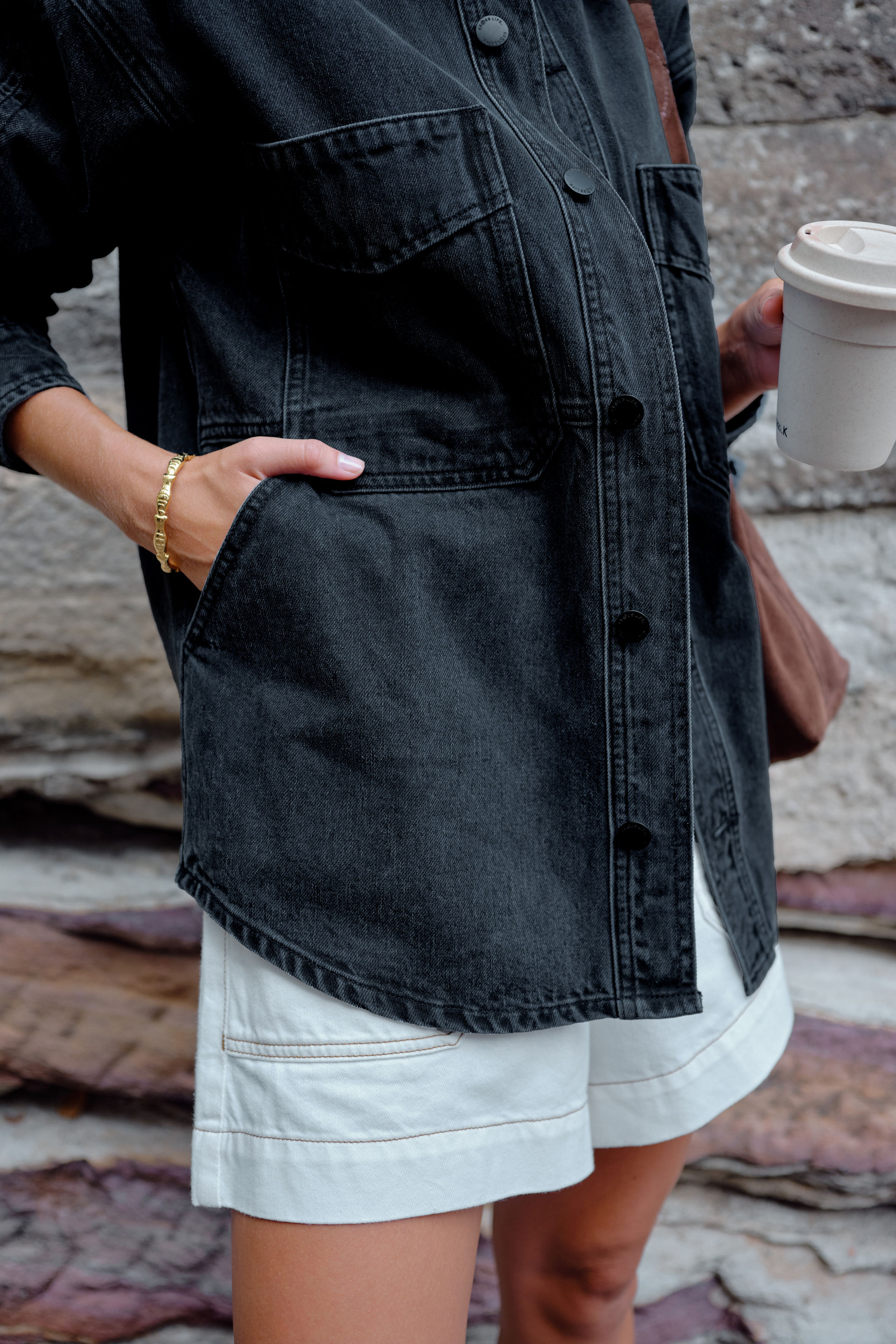 Introducing our Denim Side Pocket Shacket - the perfect blend of style and functionality. Made from our heavier weight rigid denim, this piece only gets better with time. Crafted with 30% recycled cotton featuring functional front patch pockets and side pockets, this shacket effortlessly combines practicality and fashion. The rounded shaped cuff adds a touch of playful charm, while the hip length ensures a flattering silhouette.