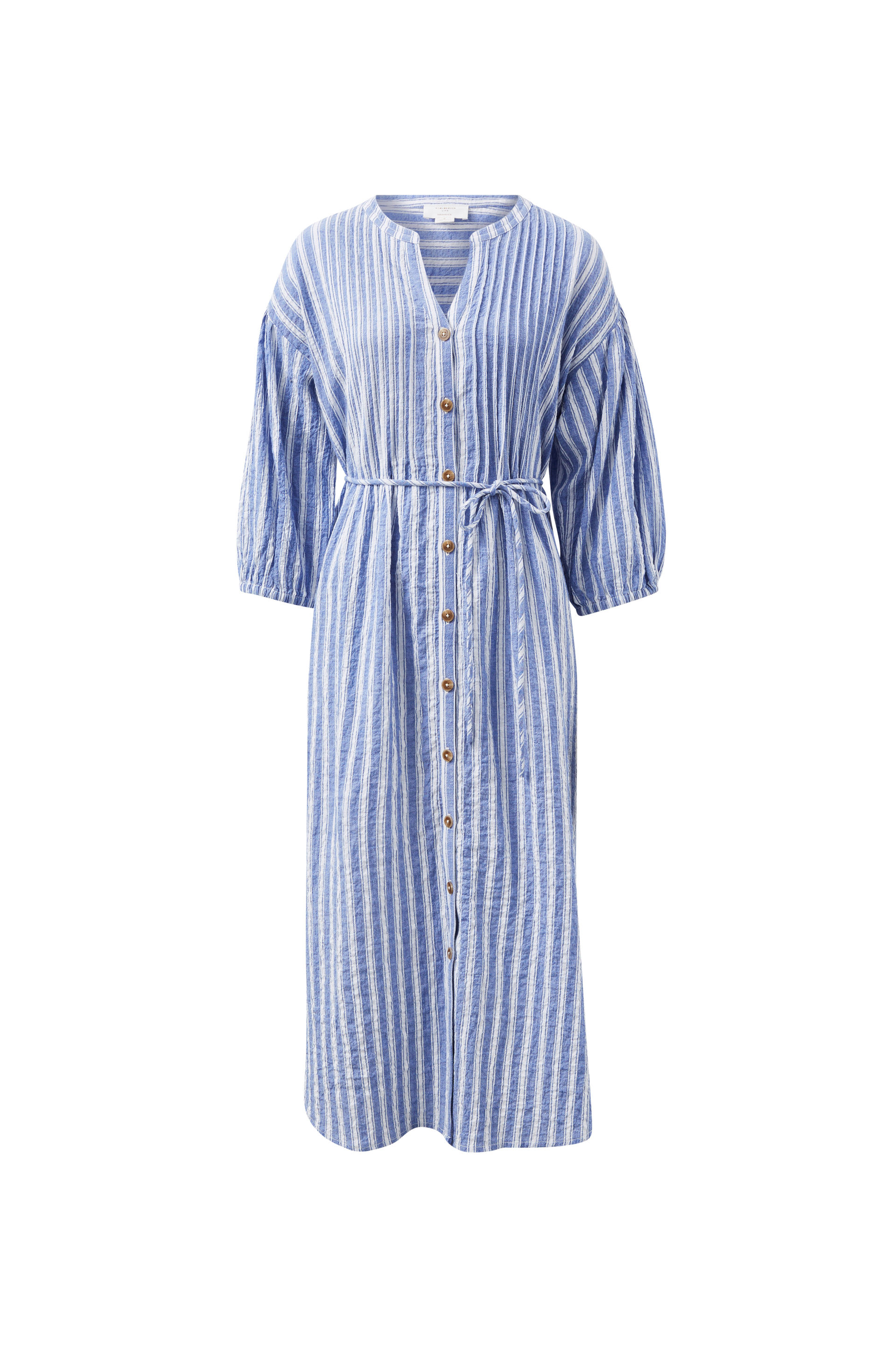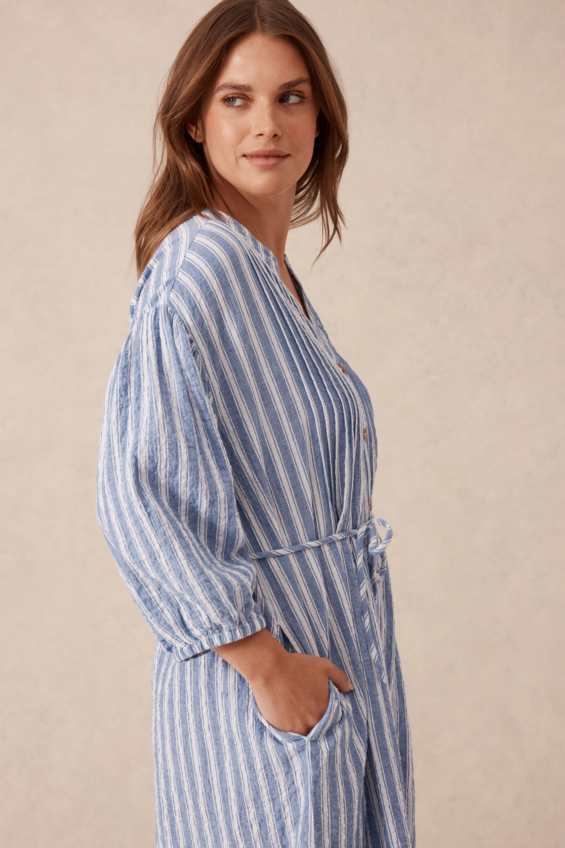 Embrace a relaxed vibe with our Crinkle Midi Dress. Crafted from organic cotton crinkle, it offers a laid-back fit, button-through style, and convenient side seam pockets for everyday ease. The self-fabric belt adds a touch of effortless charm. Perfect for the beach or that holiday getaway!