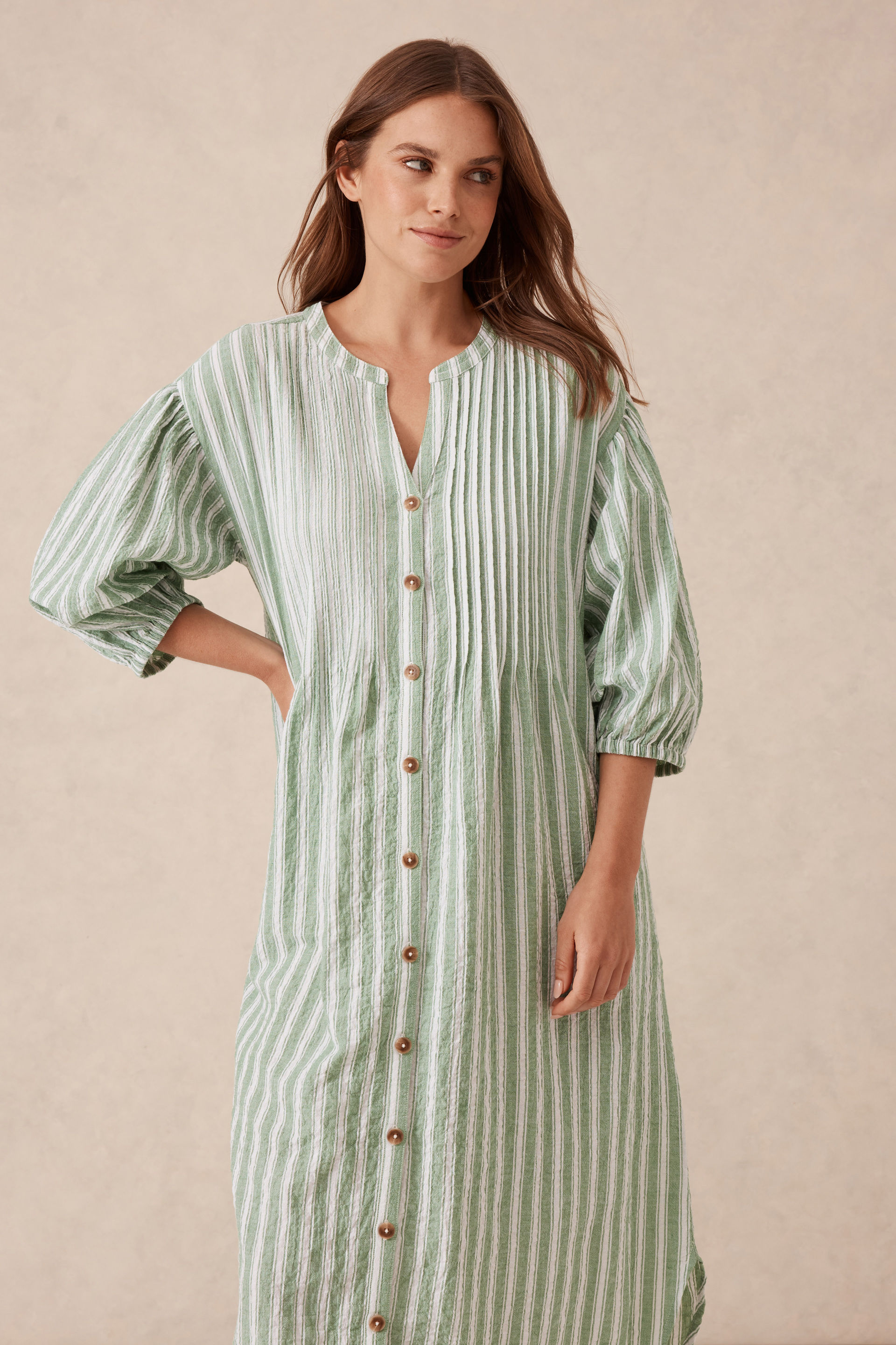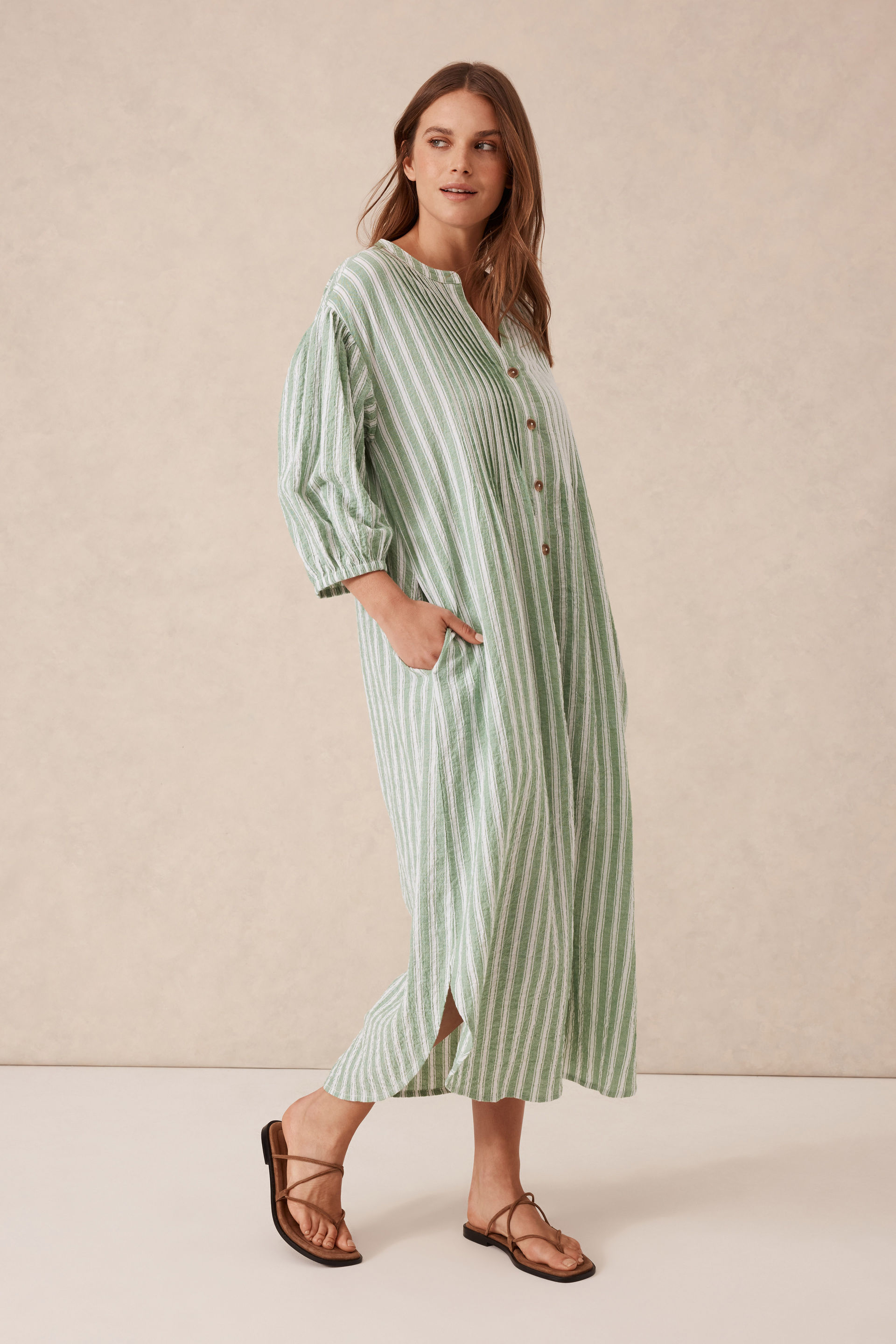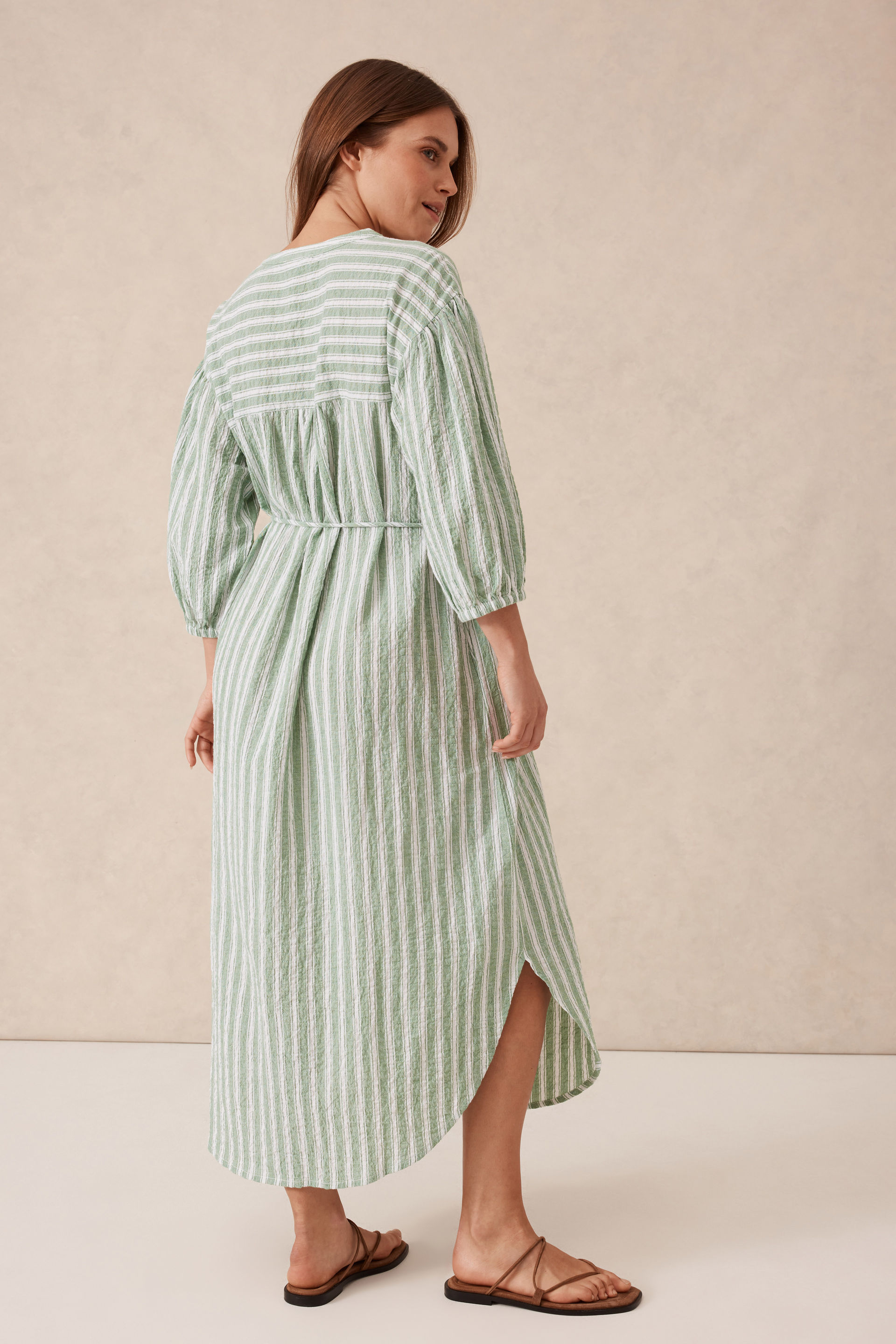 Embrace a relaxed vibe with our Crinkle Midi Dress. Crafted from organic cotton crinkle, it offers a laid-back fit, button-through style, and convenient side seam pockets for everyday ease. The self-fabric belt adds a touch of effortless charm. Perfect for the beach or that holiday getaway!