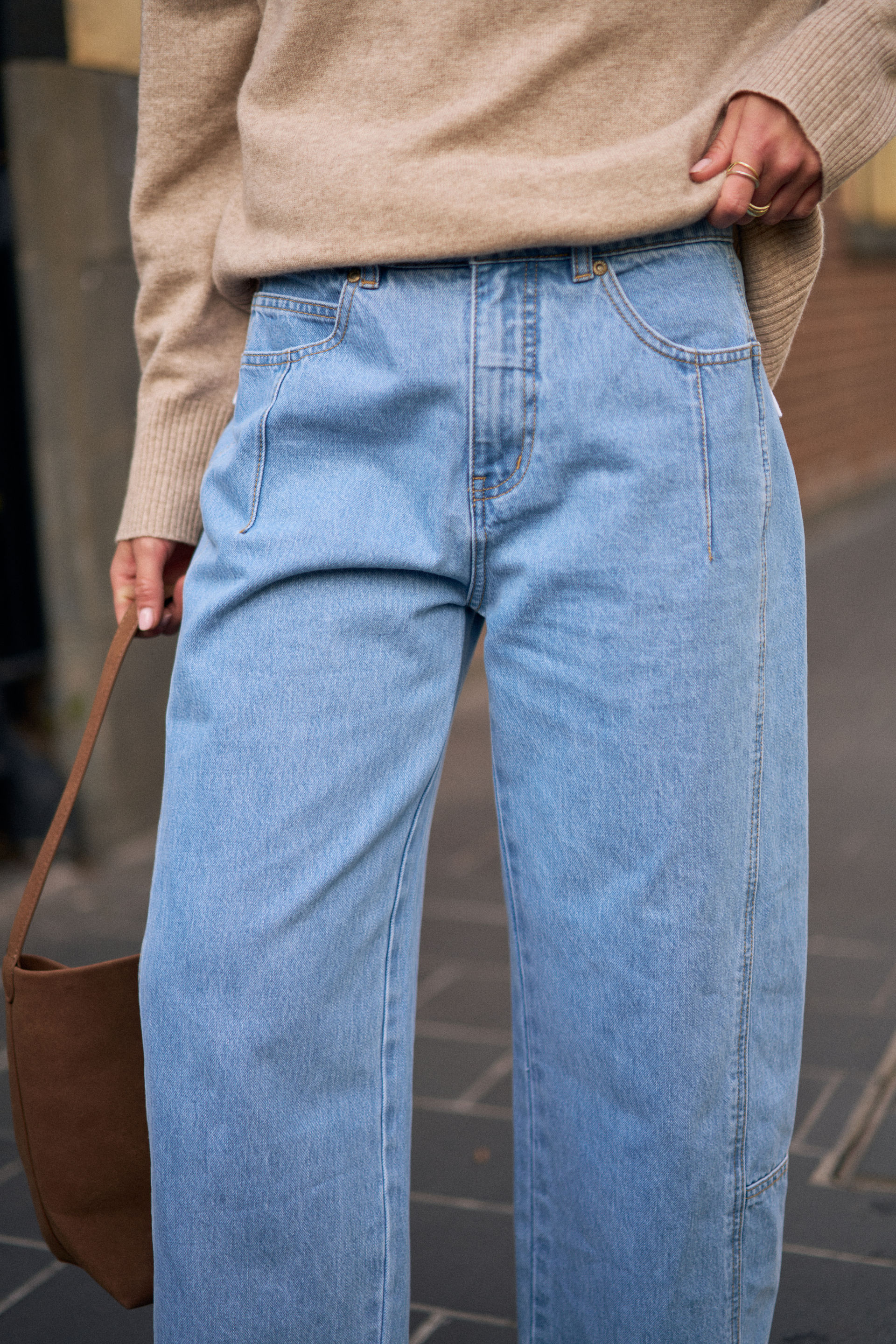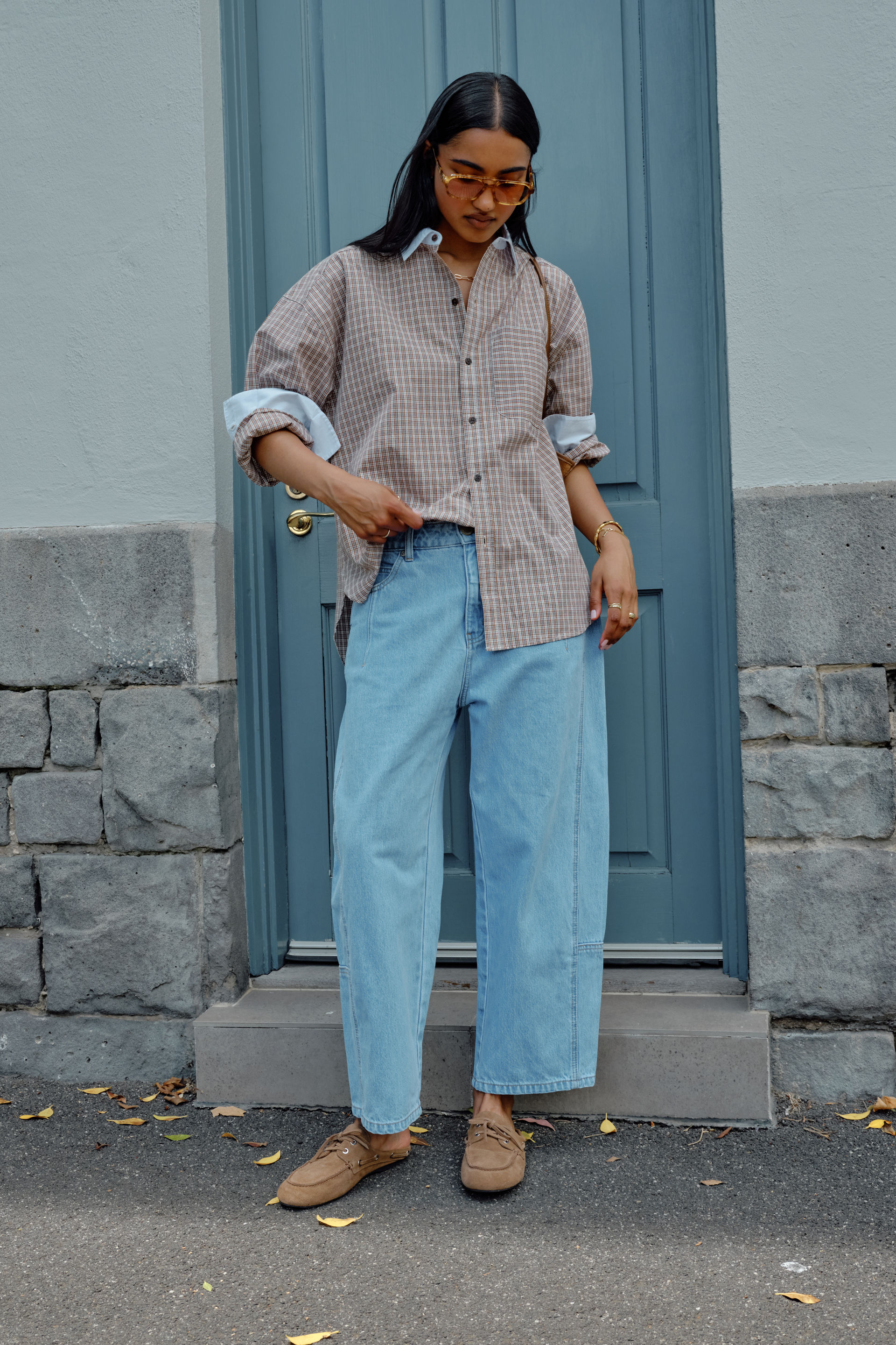Introducing the Darted Tapered Barrel Jean, made from heavy rigid denim with 21% recycled cotton. With a mid-rise fit and a tapered barrel leg that hits just above the ankle, these jeans offer a slightly cropped, flattering silhouette. The dart detailing on the front pockets and side panel seam add a touch of subtle style. Your new go-to for effortless, everyday cool.