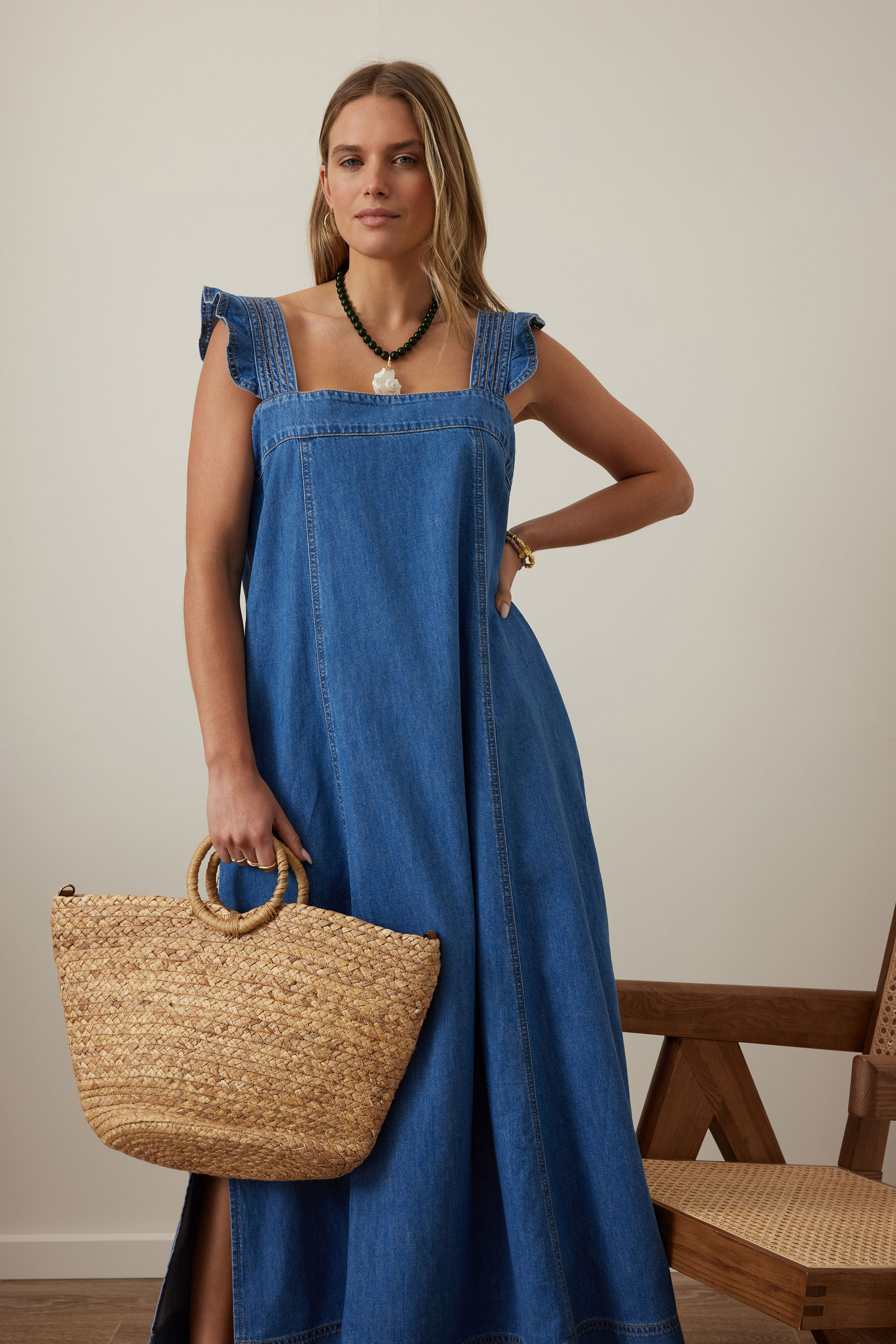 The Nola Midi Dress is thoughtfully crafted from lightweight denim blending 53% organic cotton and 20% linen.  Its midi length, square neckline, and fixed wide straps with frill details create effortless style, while side splits add just the right touch of ease. Ideal for relaxed weekend brunches or trips to the local market, it’s designed to fit seamlessly into your busy life and be your go-to easy choice.