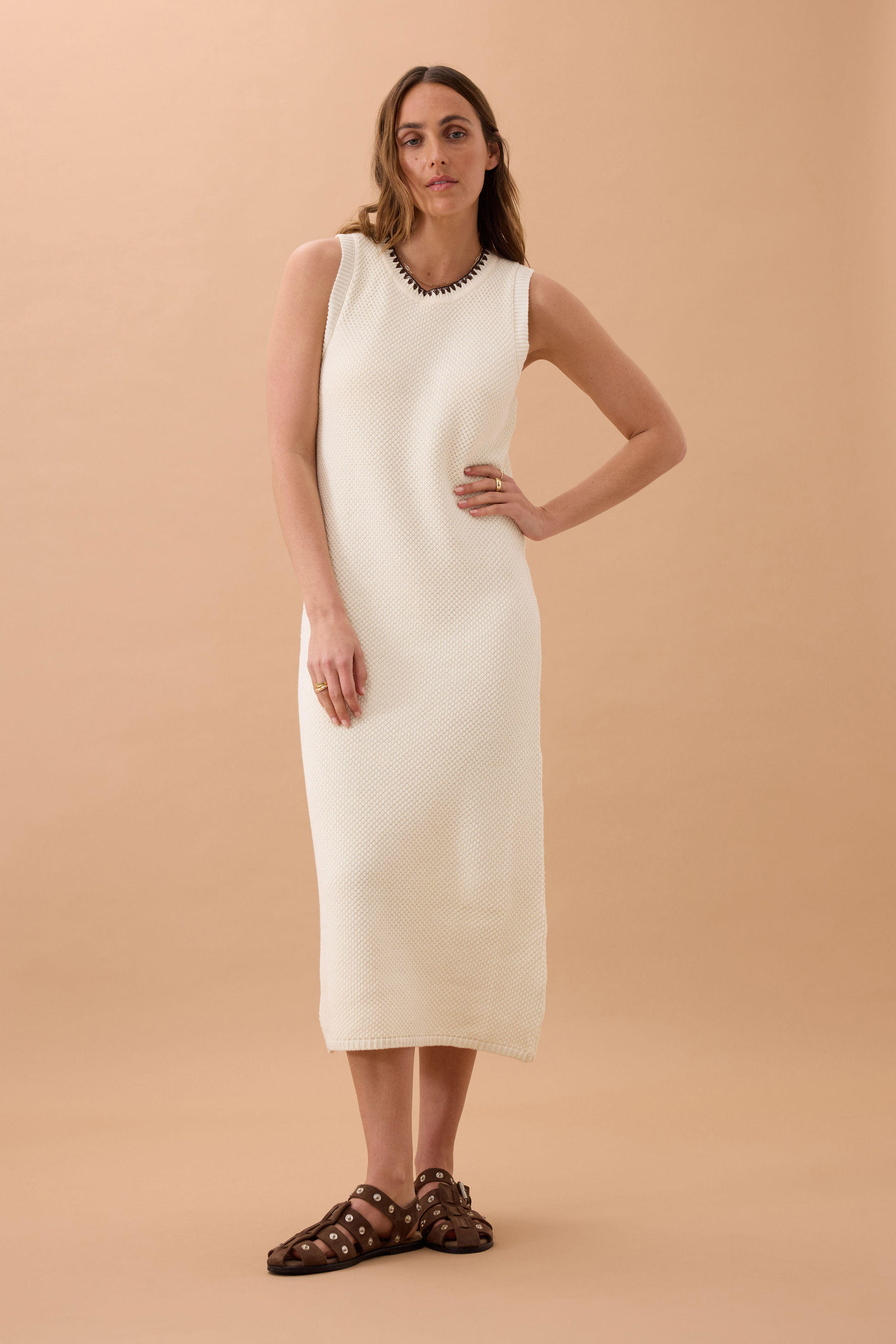 Effortlessly chic, the Olive Knit Midi Dress blends 100% organic cotton with a textured stitch. Feating a contrast blanket stitch neckband for style detail, this dress will be a wardrobe staple. Perfect for your weekend brunch, casual office days, or a relaxed evening stroll—versatile style to suit what ever the day throws at you.