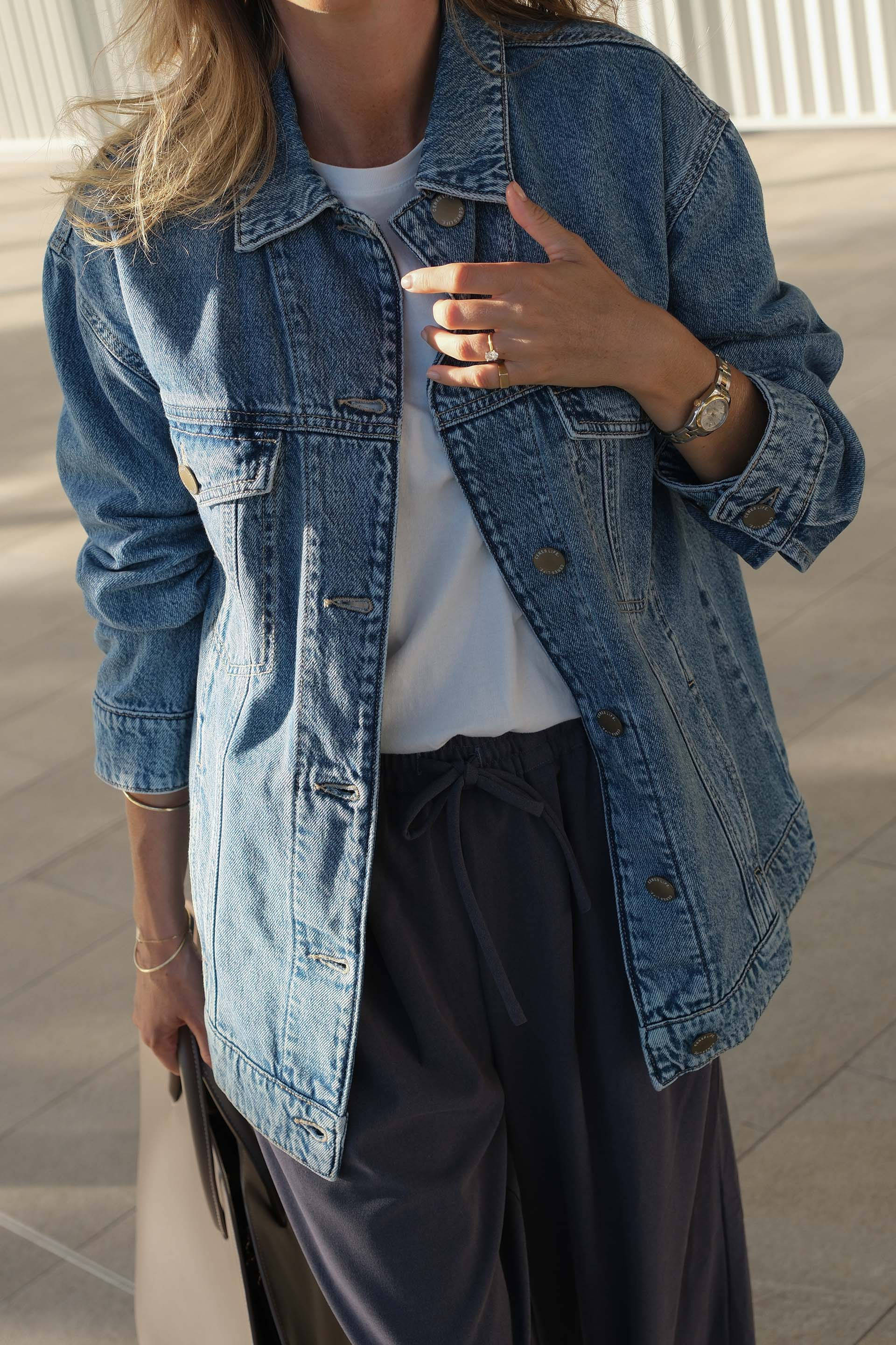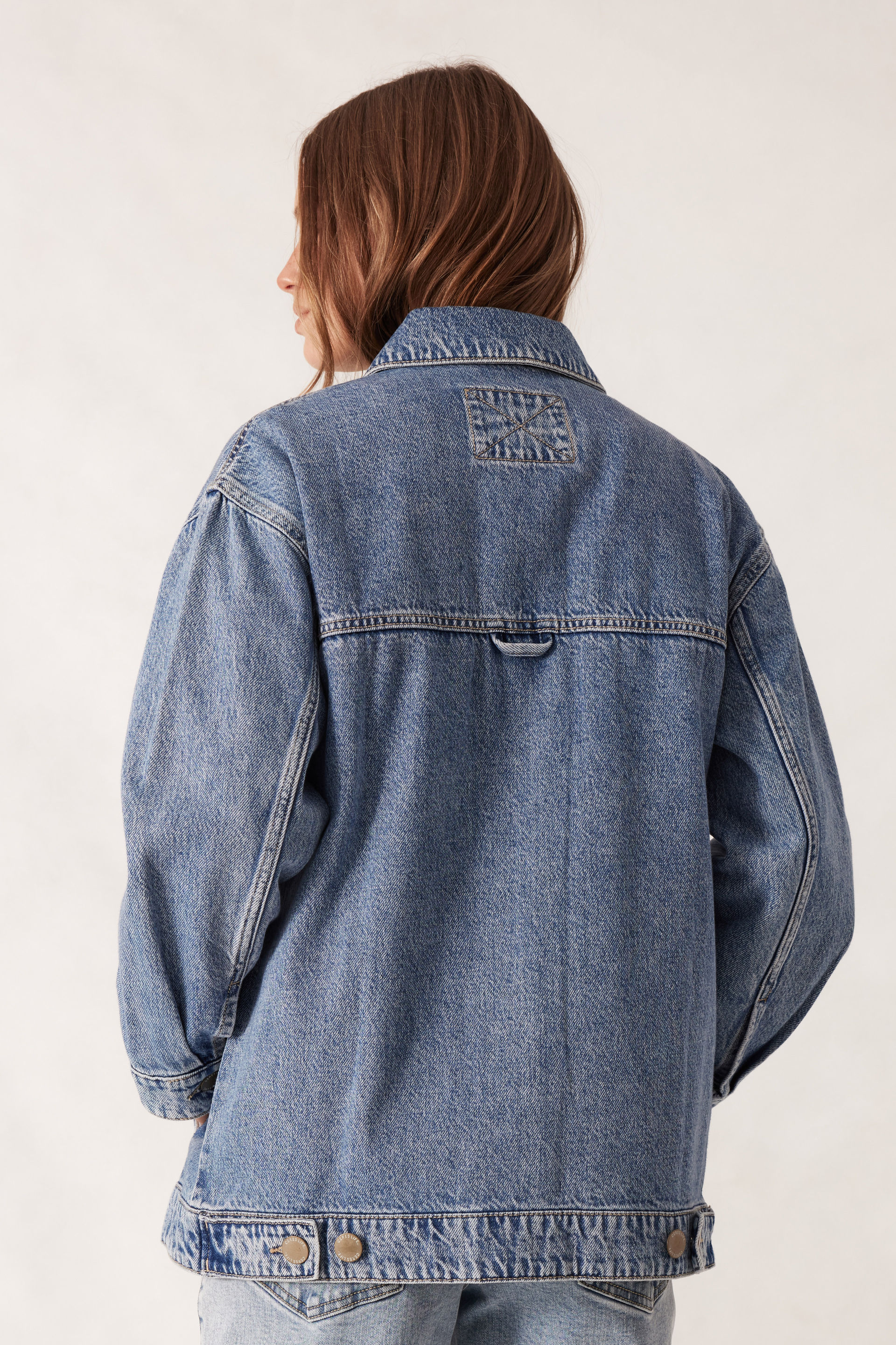 Introducing our Oversized Denim Trucker - your new go-to for laid-back cool. Crafted from soft mid-weight denim in 100% organic cotton. With an oversized boyfriend fit, back seam detail, dropped yoke, and handy front seam pockets, this jacket is the perfect blend of effortless style and will be a laid-back essential in your wardrobe.