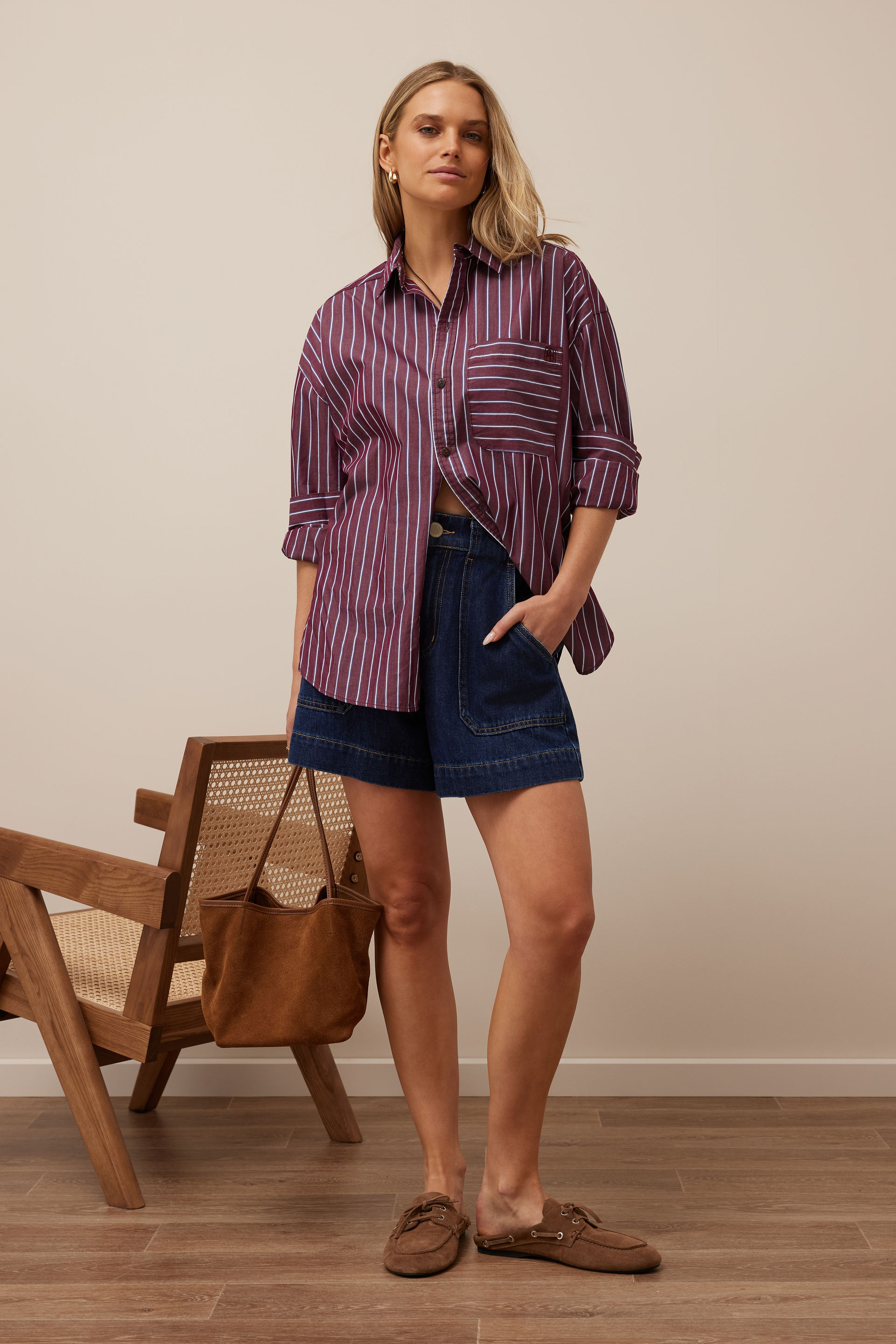 Peta Oversized Shirt, BURGUNDY WASHED NAVY STRIPE