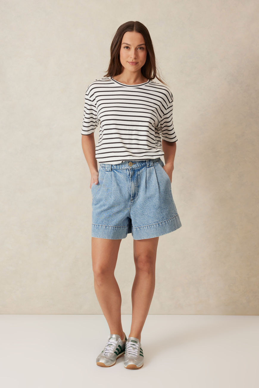 Refine your casual dressing with these pleat front shorts. These shorts have a soft drape and feature a wide leg opening for a flattering silhouette. Detailed with a wide elasticated back waist band, wide belt loops, button fly front, slanted side pockets and back patch pockets.