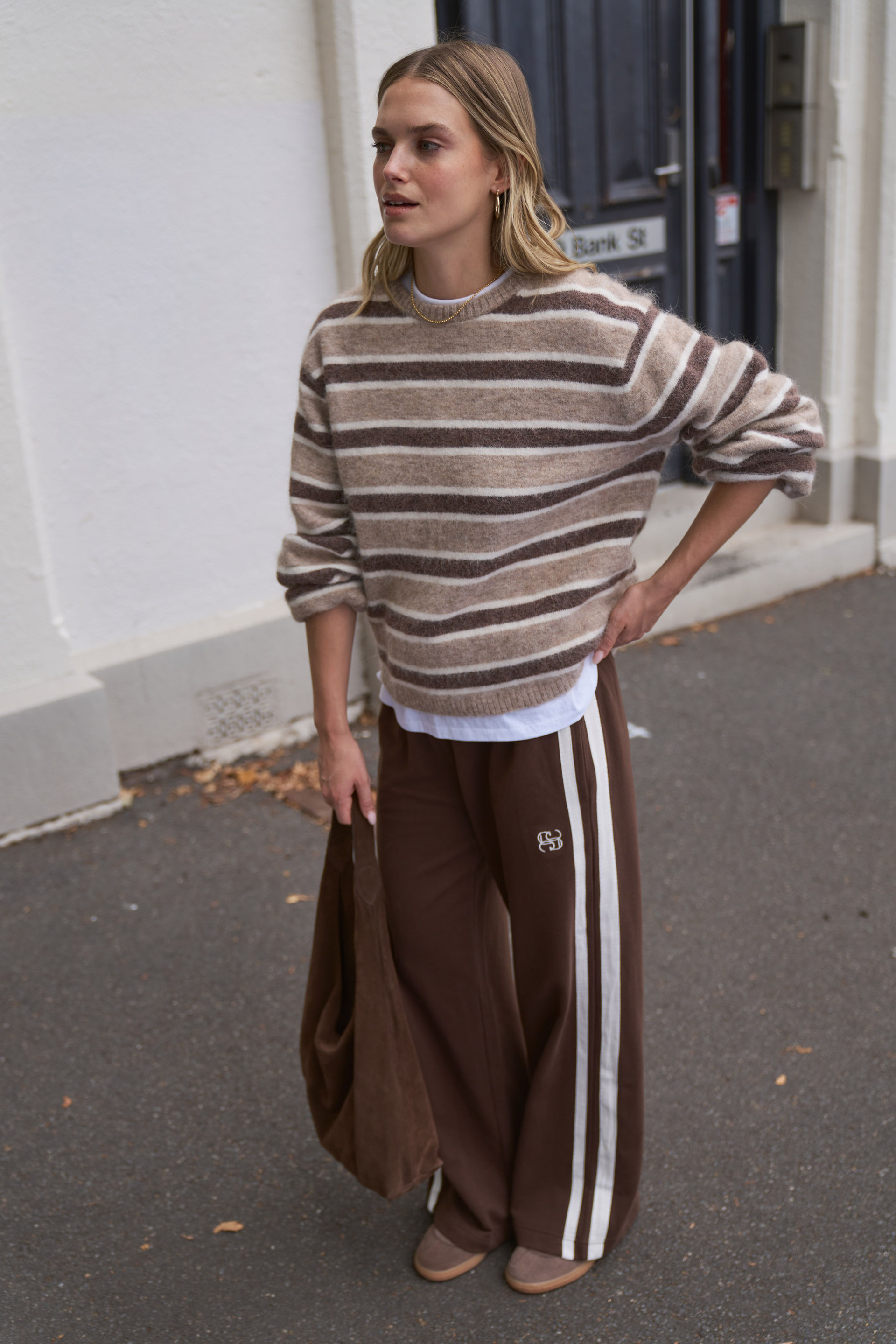 Gigi Wide Leg Terry Trackpant, CHOCOLATE SIDE STRIPE
