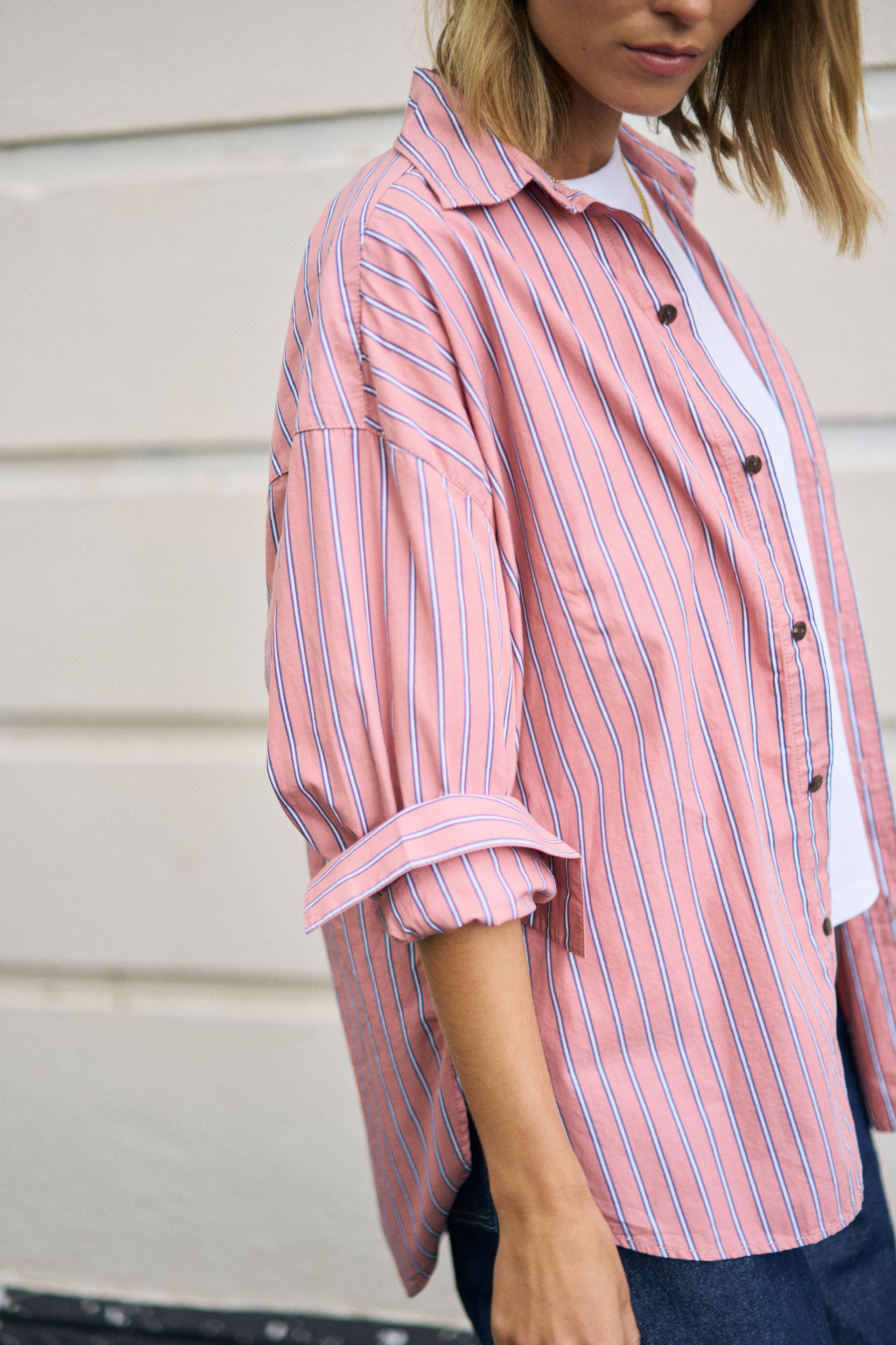 The team favourite, the Oversized Poplin Shirt, is intentionally designed in a relaxed fit with a drop shoulder and oversized chest pocket. For this colour we have used a finer organic cotton poplin to intensify the colours in the stripes, giving it a luxurious sheen. It’s finished with thoughtful details like knife pleats at the cuffs, forward shoulder seams, and mid-weight topstitching throughout.