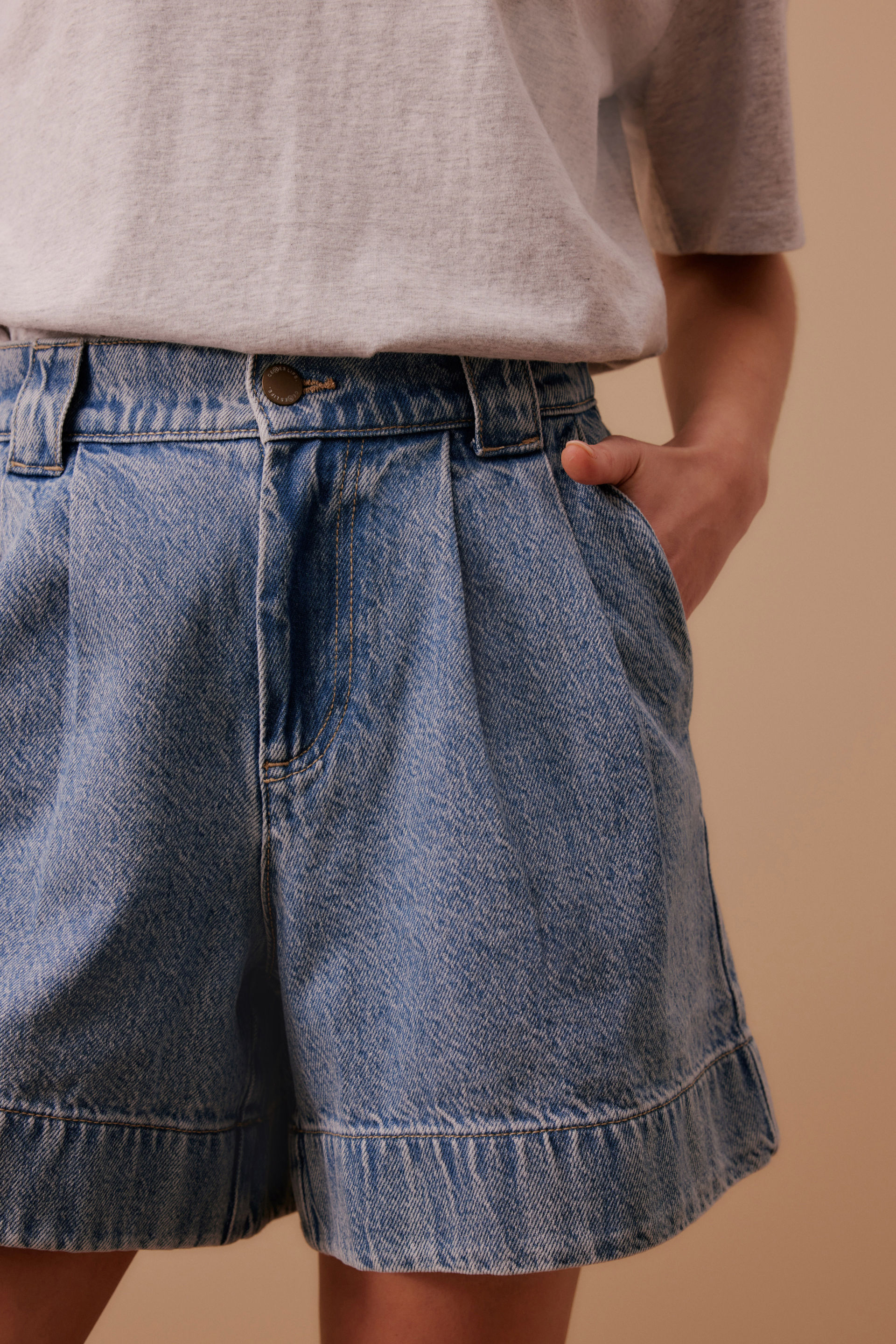 Refine your casual dressing with these pleat front shorts. These shorts are made from organic denim and feature a wide leg opening for a flattering silhouette. Detailed with a wide elasticated back waist band, wide belt loops, button fly front, slanted side pockets and back patch pockets.